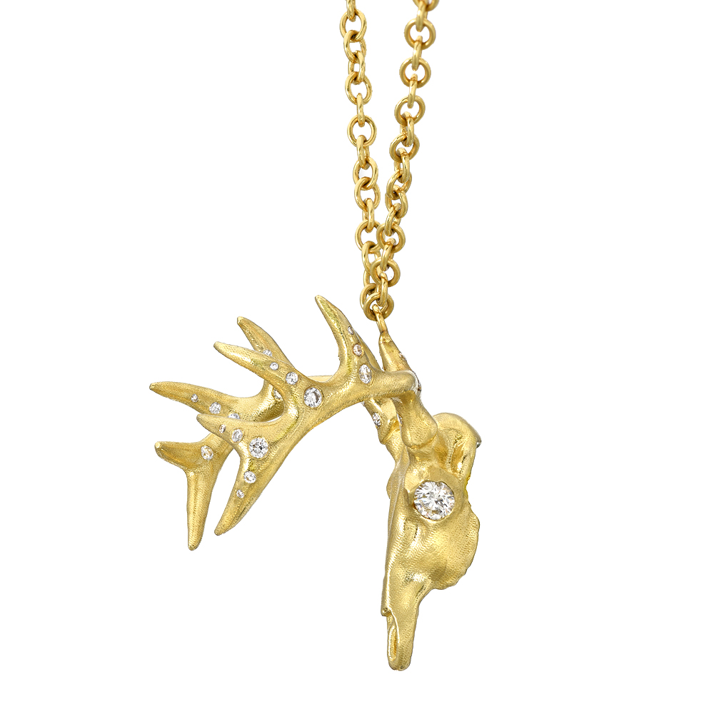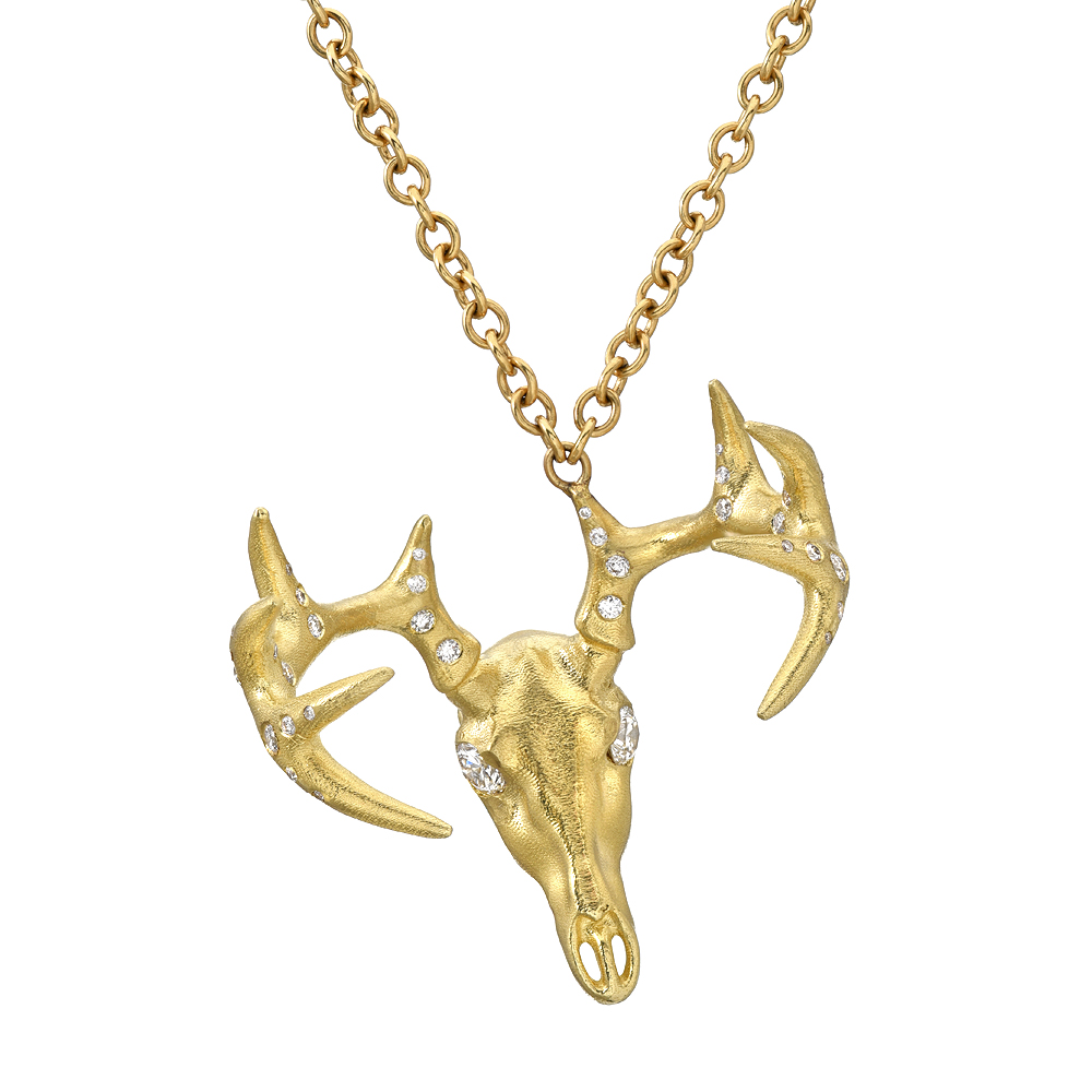 Tiny 18k deer skull is set with large diamond eyes and antlers