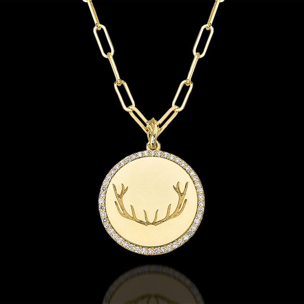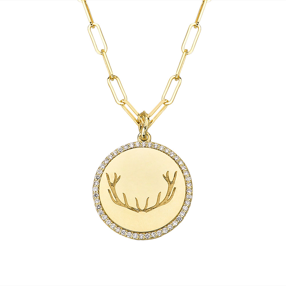 A pure circle of diamonds surrounds our antler motif on an ever popular paperclip chain