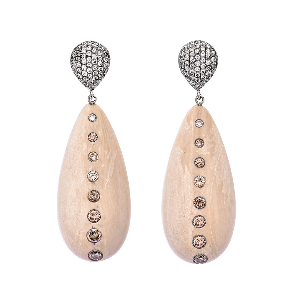 White gold and diamond toppers hold mammoth drops set with ombre colored stones inspired by a corset